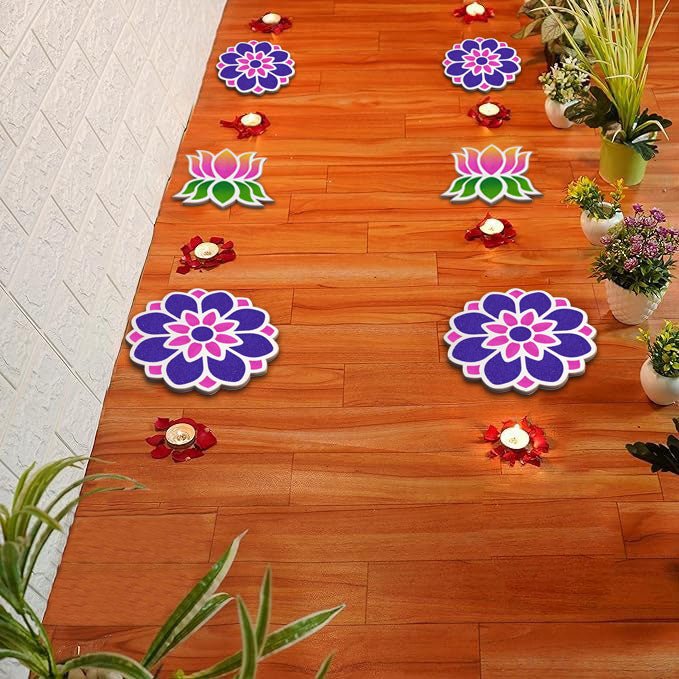 • Durable Materials: Crafted from wooden tools, the mat is built to last, ensuring you can use it for many Diwalis to come. Endless Design Possibilities: Explore an array of designs, from traditional kolam patterns to modern floral and border designs, with our versatile stencils.