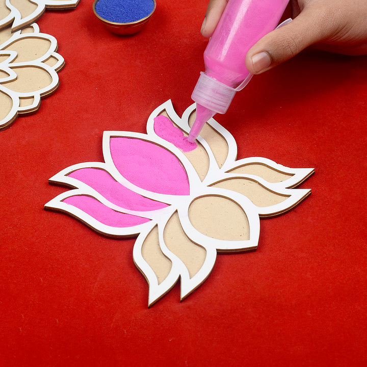 • Material & Size: Portable Rangoli crafted from MDF material not flexible like any other so that you can easily move even filled rangoli here and there. They are available in four exquisite designs, each measuring 6 inches.