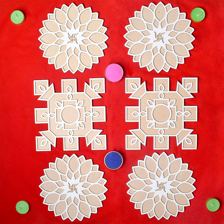 • Durable Materials: Crafted from wooden tools, the mat is built to last, ensuring you can use it for many Diwalis to come. Endless Design Possibilities: Explore an array of designs, from traditional kolam patterns to modern floral and border designs, with our versatile stencils.