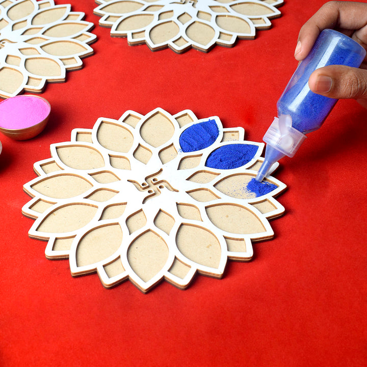 • Material & Size: Portable Rangoli crafted from MDF material not flexible like any other so that you can easily move even filled rangoli here and there. They are available in four exquisite designs, each measuring 8 inches.