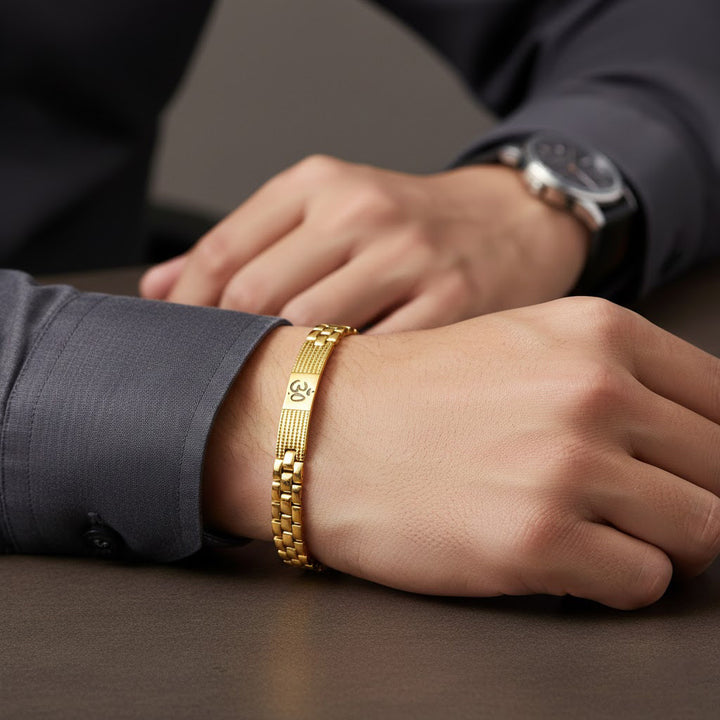 About Product: This Gold Plated Om Bracelet is a harmonious blend of spirituality and refined elegance, featuring the sacred Om (ॐ) symbol finished with premium IGP (Ion Gold Plating) coating. Crafted using advanced IGP technology, the bracelet offers enhanced durability, resistance to tarnishing, and a long-lasting rich gold shine.