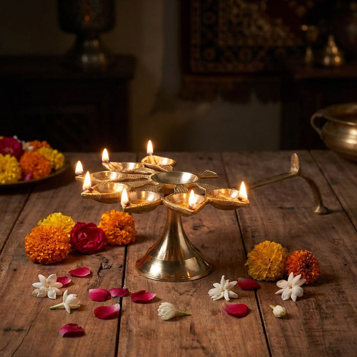 About Product: This exquisitely engraved Brass 7 Mukhi Aarti Diya reflects timeless tradition and spiritual elegance. Designed with seven wicks, it is used with oil or ghee and cotton wicks during sacred rituals and aarti. Lighting the diya symbolizes positivity, purity, and the start of auspicious occasions. Meticulously handcrafted from high-quality brass, this 7 Mukhi Aarti Diya adds a refined touch to home temples and sacred spaces. Ideal for daily prayers, Diwali celebrations, and festive rituals, it also makes a thoughtful Diwali or spiritual gift for loved ones.