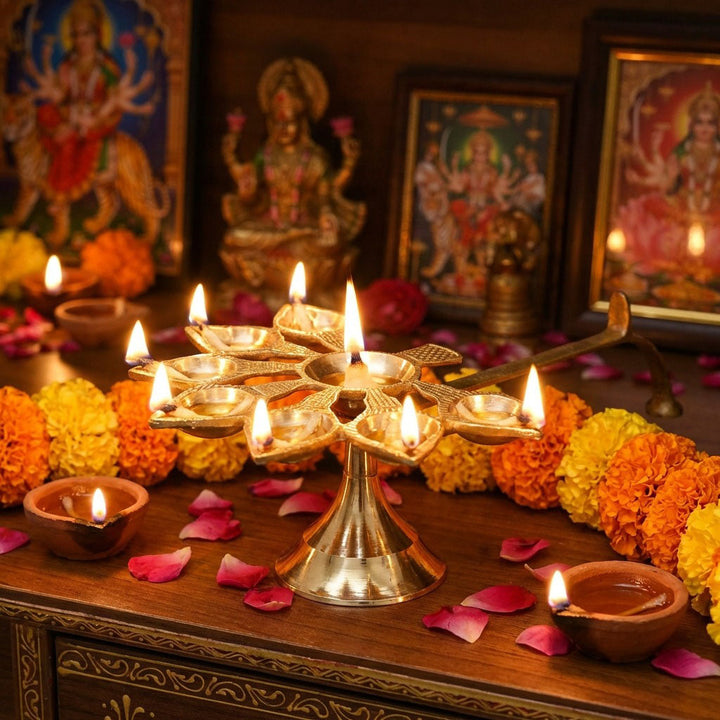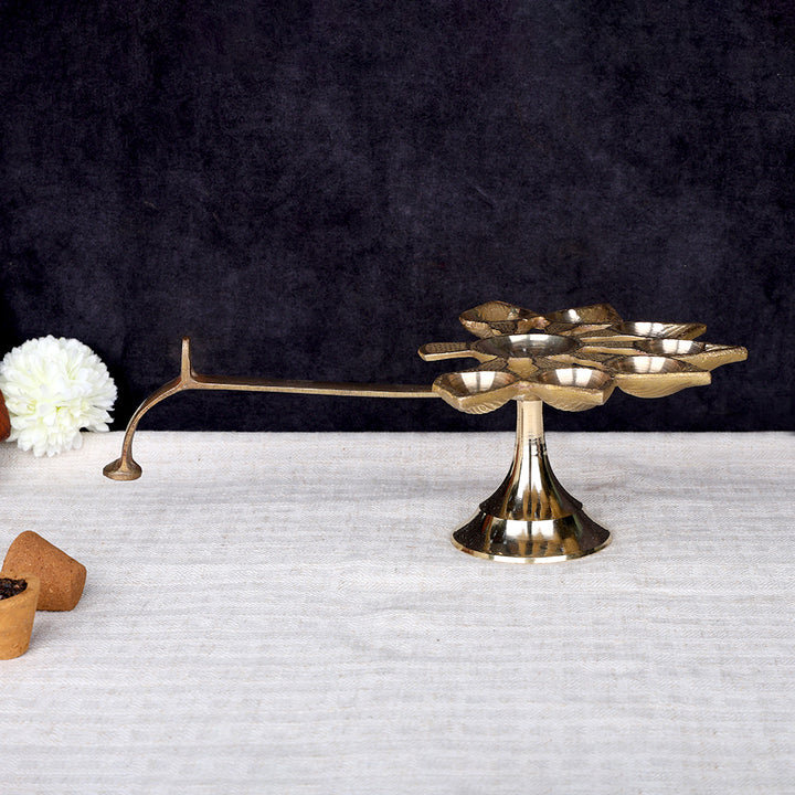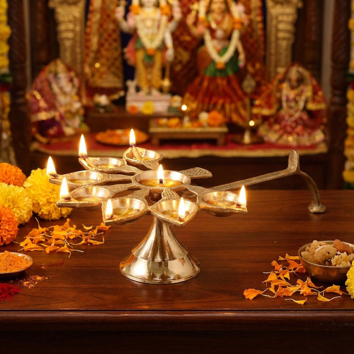 7 mukhi aarti diya | 7 aarti diya | eleven wick diya | brass aarti diya | traditional aarti lamp | brass pooja diya | spiritual lighting | handmade brass diya | decorative pooja lamp | religious brass diya | temple diya |  religious brass diya
