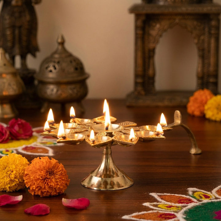 9 mukhi aarti diya | 9 aarti diya | eleven wick diya | brass aarti diya | traditional aarti lamp | brass pooja diya | spiritual lighting | handmade brass diya | decorative pooja lamp | religious brass diya | temple diya |  religious brass diya