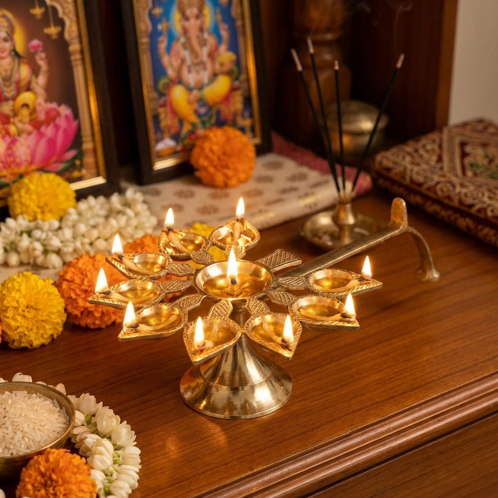 About Product: A beautifully engraved Brass 9 Mukhi Aarti Diya is an essential element for every pooja ritual. Designed with nine wicks, this traditional aarti diya is used with cotton wicks and oil or ghee during prayers and religious ceremonies. Lighting the diya marks the beginning of auspicious occasions and helps create a calm, pure, and spiritual atmosphere. Carefully handcrafted from high-quality brass, this 9 Mukhi Aarti Diya adds a touch of elegance to home temples and pooja spaces. It is perfect for daily worship, Diwali puja, and festive rituals, and also serves as a thoughtful Diwali gift or spiritual gift for family and loved ones.