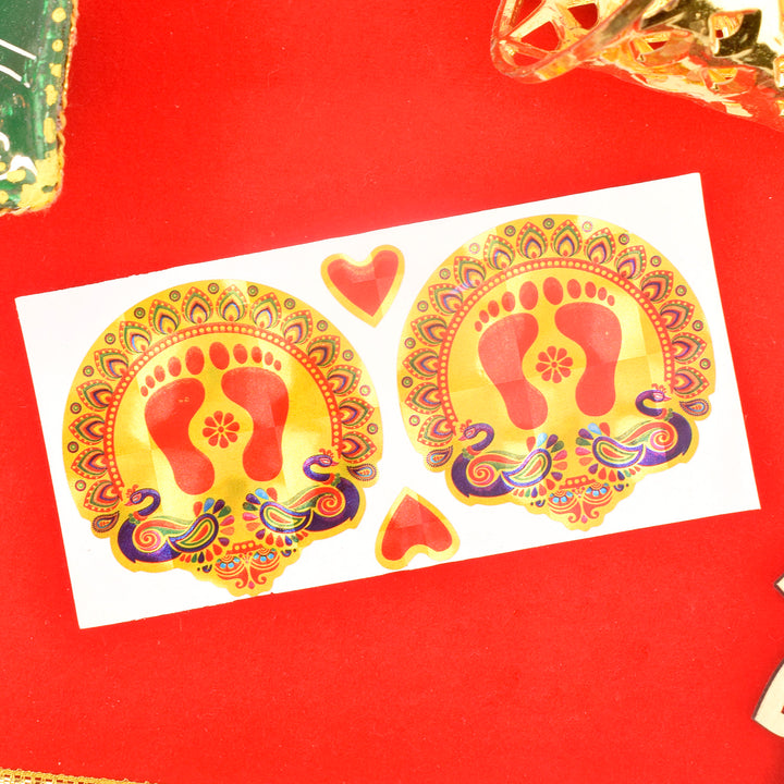 "Charan Prints with Traditional Designs Stickers (Assorted) – Celebrate spirituality with these exquisite stickers featuring Charan footprints adorned with intricate traditional patterns. Available in an assortment of vibrant designs, these stickers add a sacred and decorative touch to your spiritual spaces, gifts, or personal items."