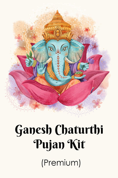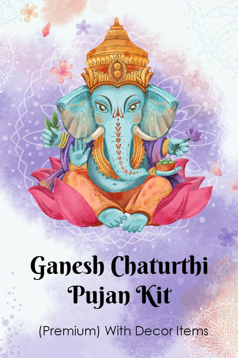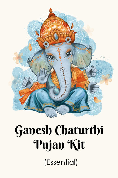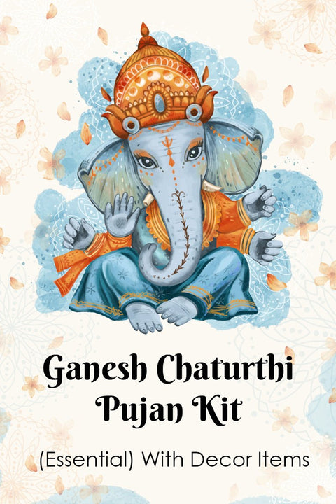 Eco Friendly Lord Ganpati Idol, Chowki, Red Cloth (Asan), Chandan Tikka, Durva, Janeu, Gangajal, Camphor, Kumkum Roli, Betel Nuts (Supari), Moli, Flowers, Fruits, Sweets, Modak, Panchaamrit, Panchmeva, Aarti Book to read, Diya, Cotton Wicks, Puja Bell, Incense Cone or stick, Dhoop, Kalash, Whole Coconut, Paan Leaf, Haldi ( Turmeric Powder)