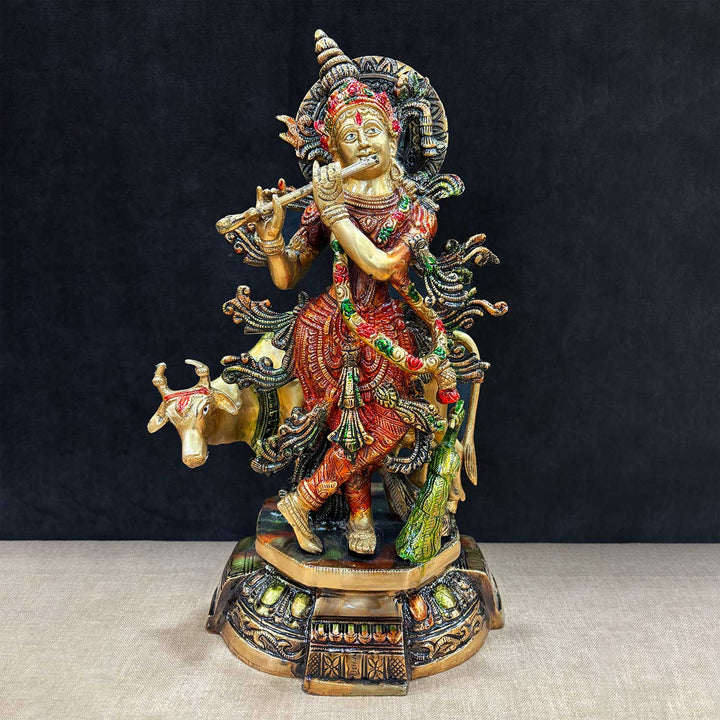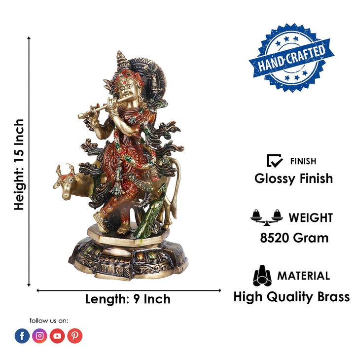 15 Inches Lovely Krishna with Cow Colorful Brass Idol – Satvikworld.com