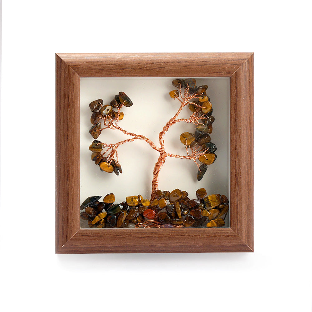 About the Product: The Tiger Eye Tree with Frame is a powerful healing stone décor piece designed to enhance confidence, courage, and protection in your space. Crafted with natural Tiger Eye crystal chips arranged in a bold tree formation, this framed artwork symbolizes strength, focus, and positive action.