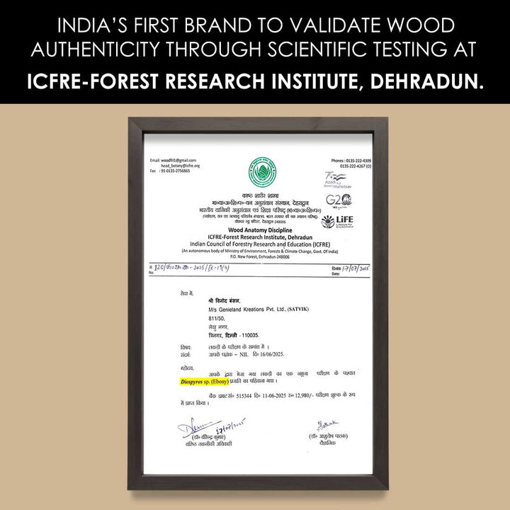 • Tested by : Authenticity certified by Central Wood Testing Laboratory The Rubber Board (Ministry of Commerce & Industry Govt. of India) and ICFRE – Forest Research Institute, Dehradun – ensuring genuine Karungali wood quality.
