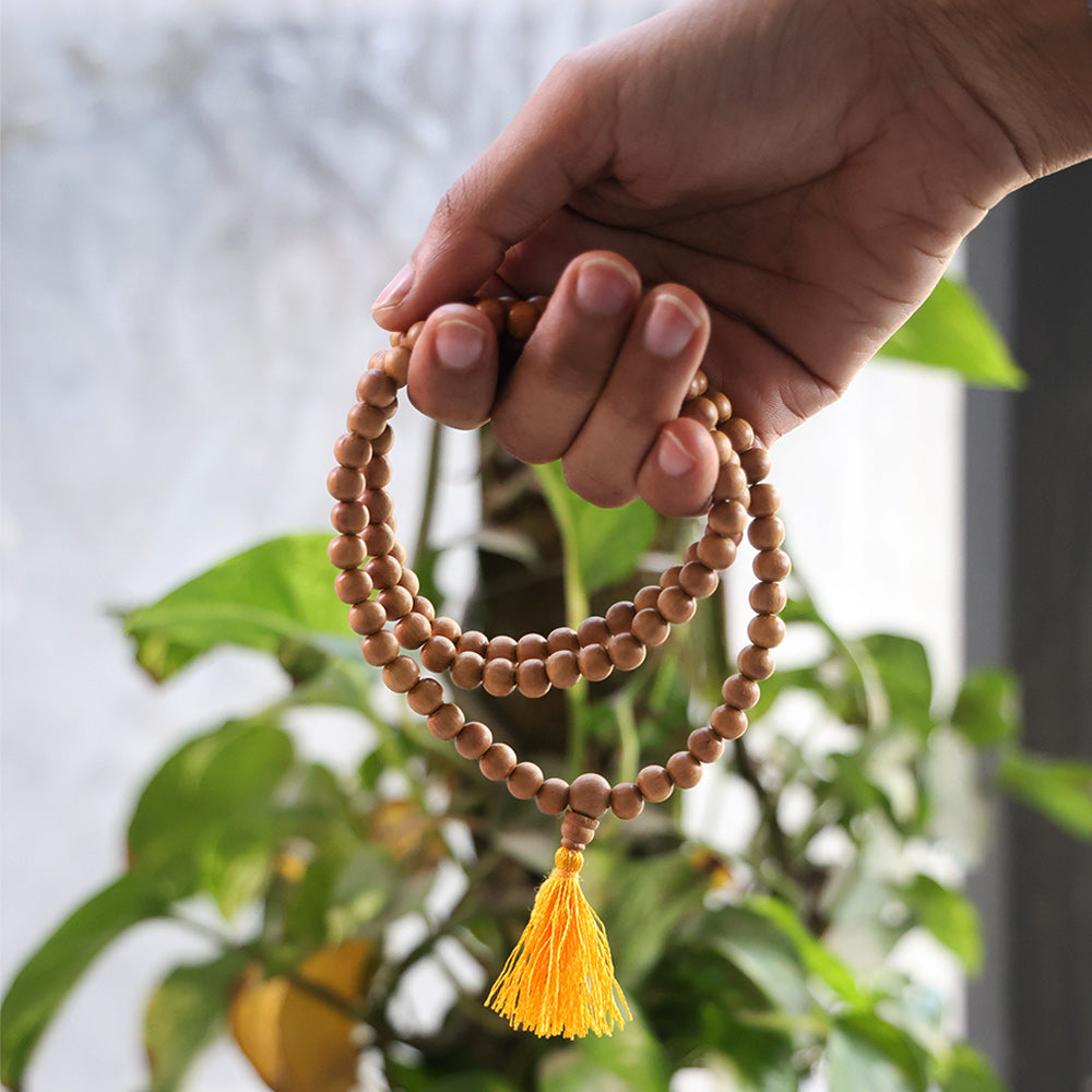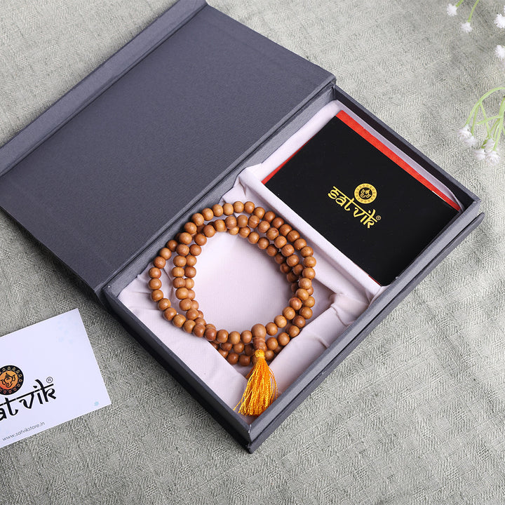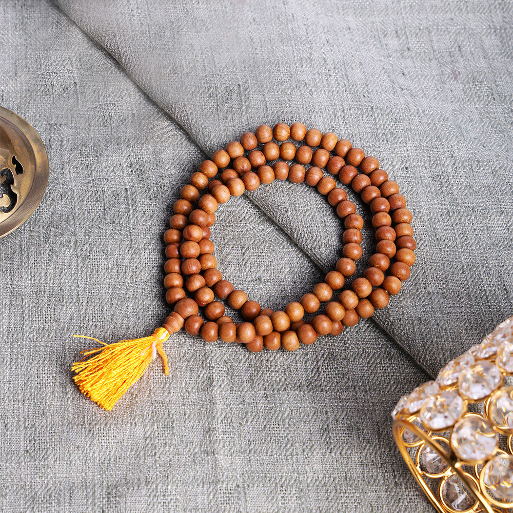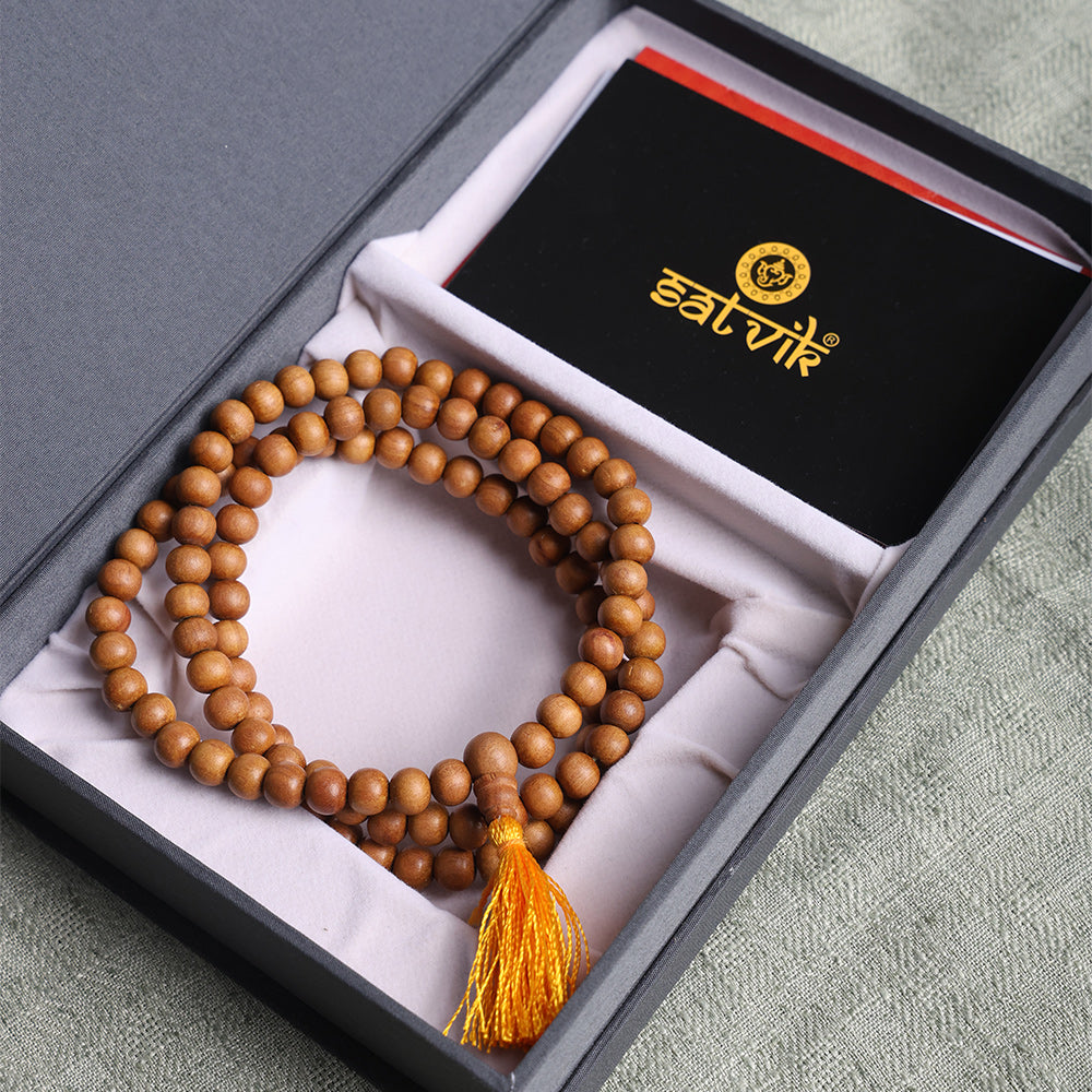 A Sandalwood Mala is a traditional and sacred meditation tool used in various spiritual and religious practices, particularly in Hinduism and Buddhism. It consists of a string of beads, typically 108 in number, although there are variations with different bead counts. Each bead is made from genuine sandalwood, specifically from the heartwood of the sandalwood tree (Santalum album).