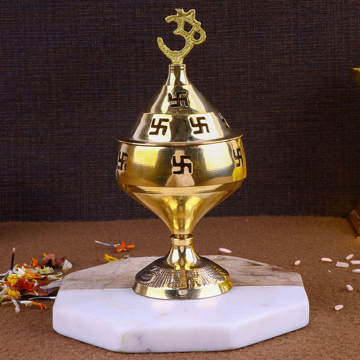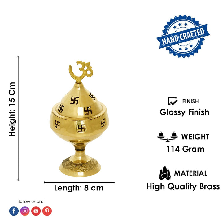 Akhand Jyot Diya Wonderful Om Akhand Oil Lamp made in Brass also called as Akhand Jyot with 'Om' Symbol on the top of the lamp and swastik symbol engraved on all sides of the lid and the lamp . This is a handcrafted piece of beautifully designed Indian brass Kuber Diya or Deepak ,which is known to be quite auspicious. It has a lovely OM symbol on the top and swastik symbol on all sides of the lid and the lamp . It is one of its kind and believed to be quite auspicious It looks amazingly beautiful when lit and spreads a marvelous sight with light passing through the swastik symbol . DIYA OIL BURNER WITH OM ON TOP FOR PUJA AARTI IN TEMPLE.