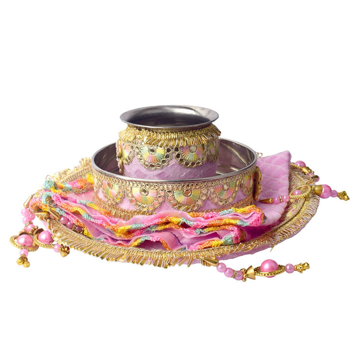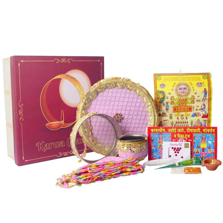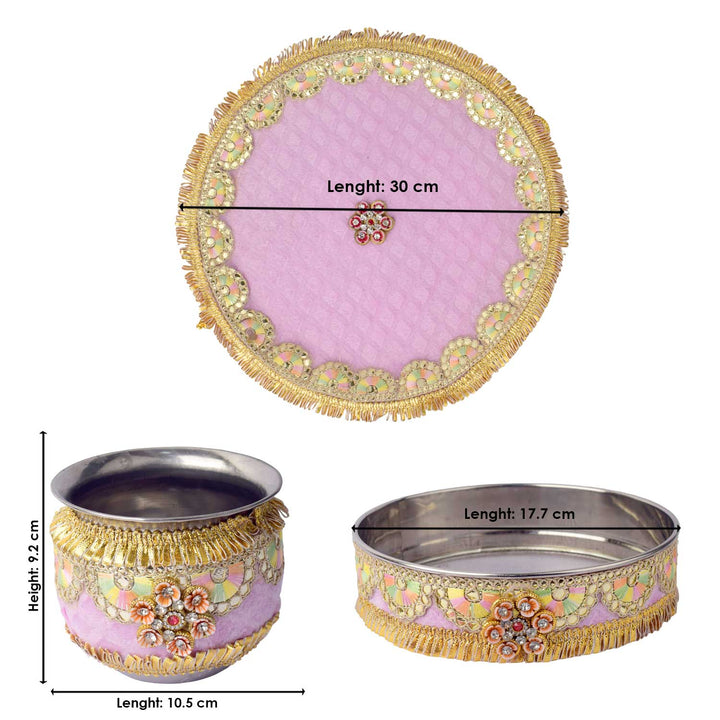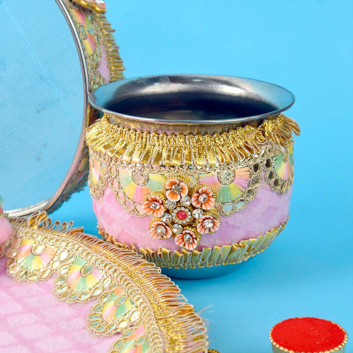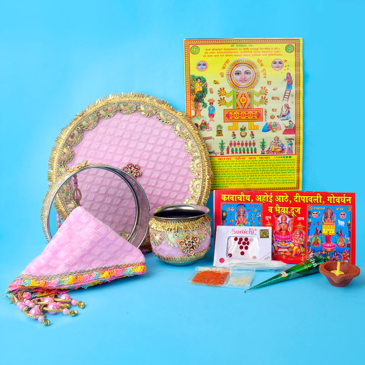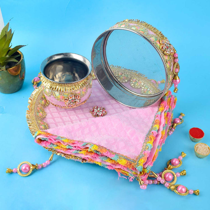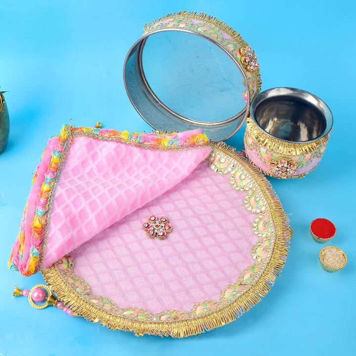 Buy Baby Pink Embroidery Karwa Chauth Thali Set 11 Pc | Satvikworld.com