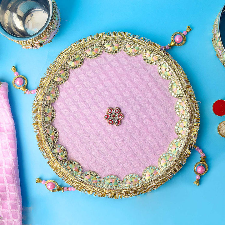 • Soothing Baby Pink Theme: Soft pink embroidery gives the thali a calming and festive touch.