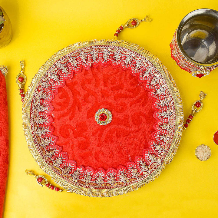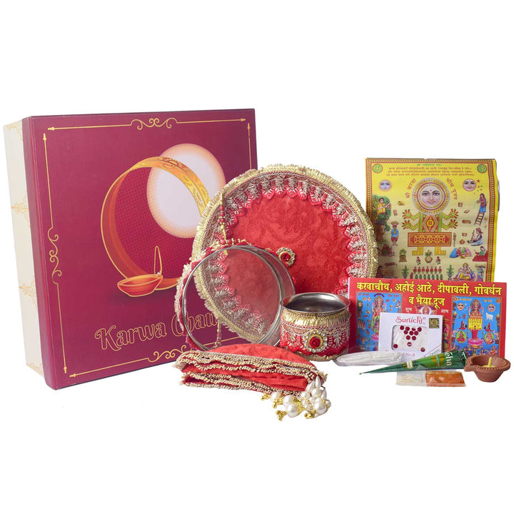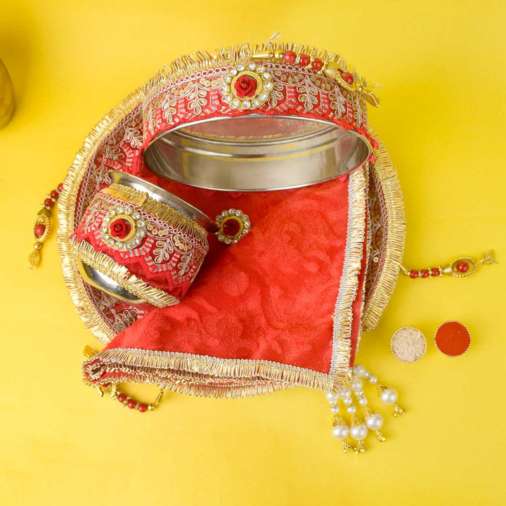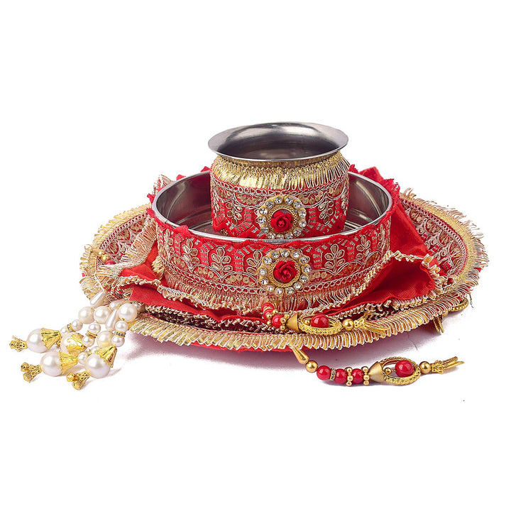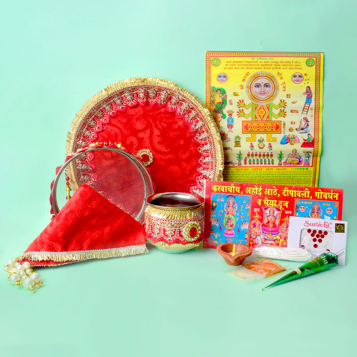 Shop Elegant Red Karwa Chauth Thali Set 11 Pc Online | Satvikworld.com