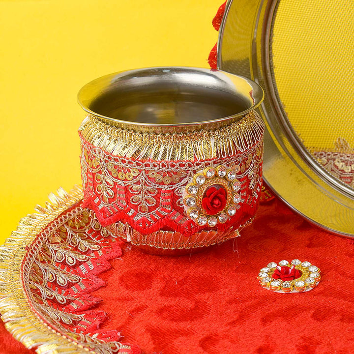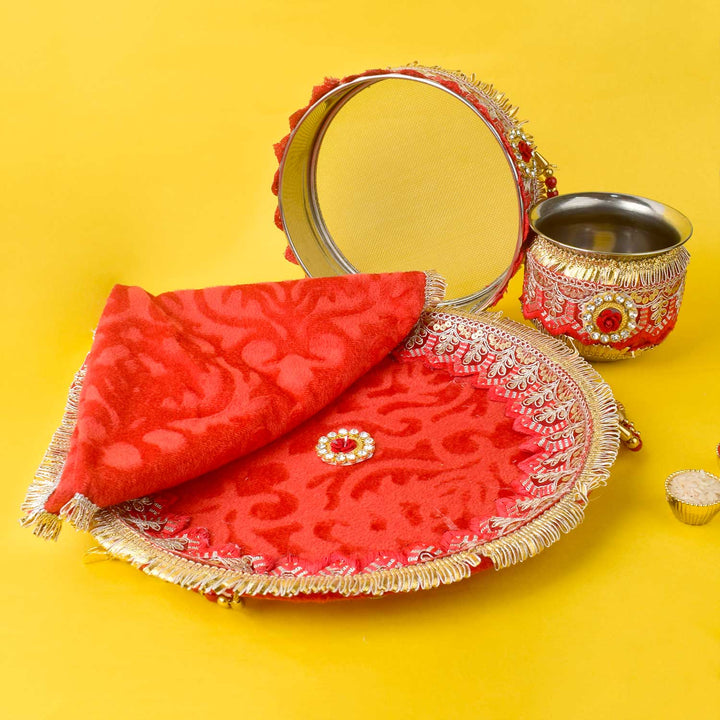 Elegant Red Karwa Chauth Thali | Karwachauth Puja Kit | Embroidered Thali with Sieve and Kalash | Red Pooja Thali Set | Designer Karwa Chauth Thali | Karva Chauth Thali Cover Set | Karwa Chauth Complete Kit | Red Thali Gift Set
