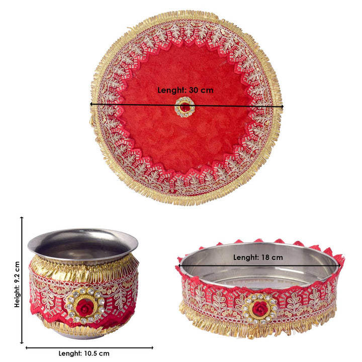 Item Name: 11 Pc Elegant Red Embroidery Karwa Chauth Thali Set with Cover – Complete Puja Kit
