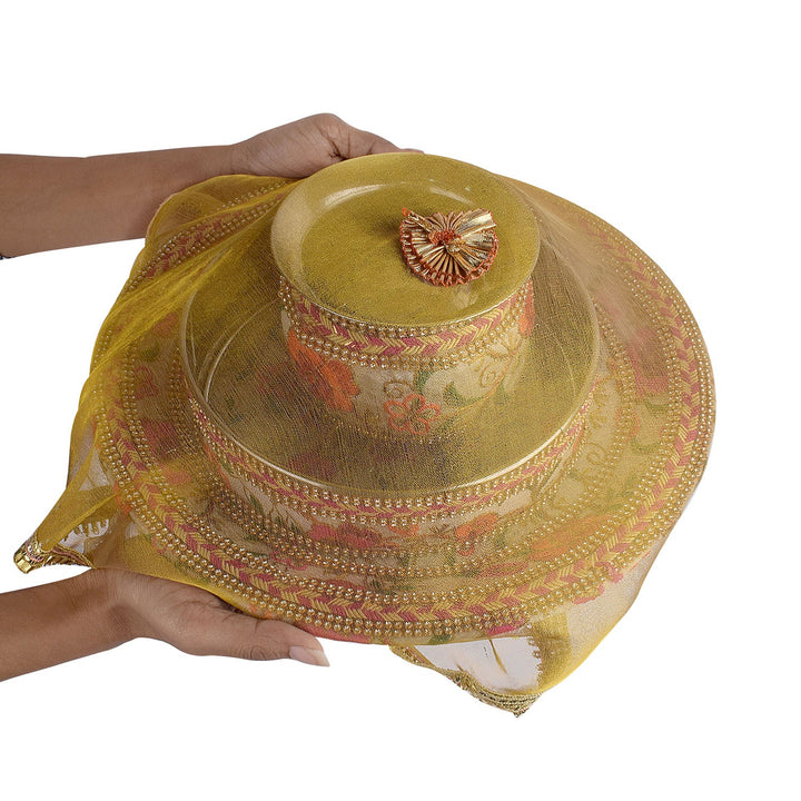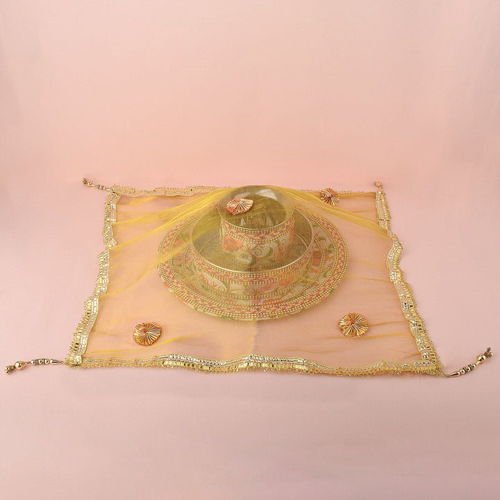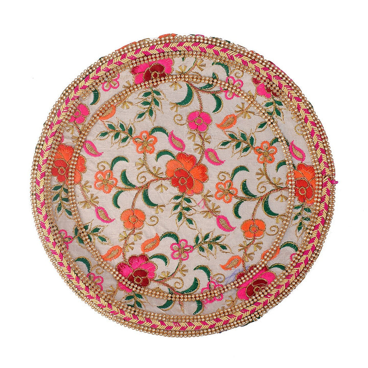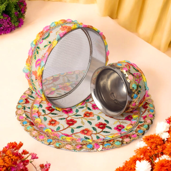 11 Pc Floral Embroidery Karwa Chauth Thali Set with Cover