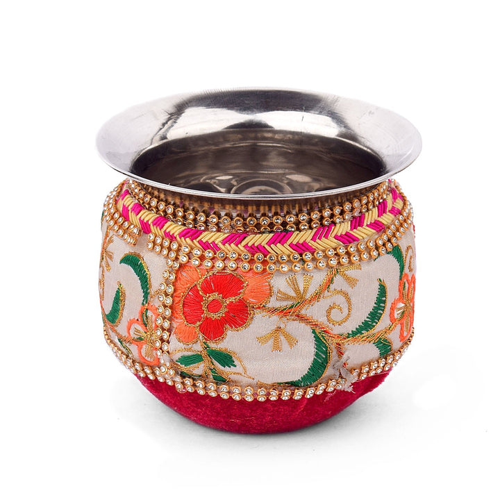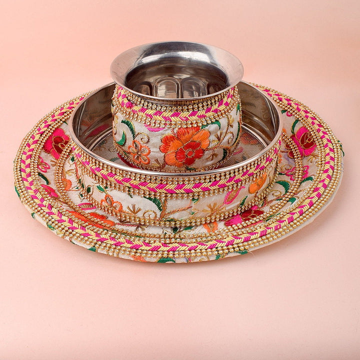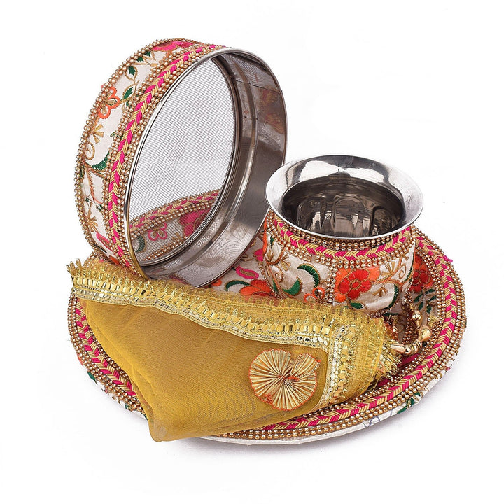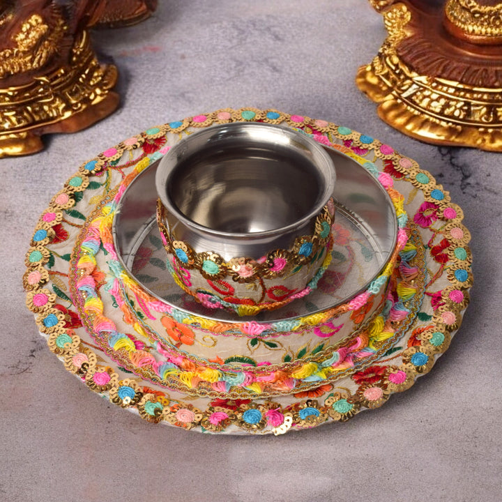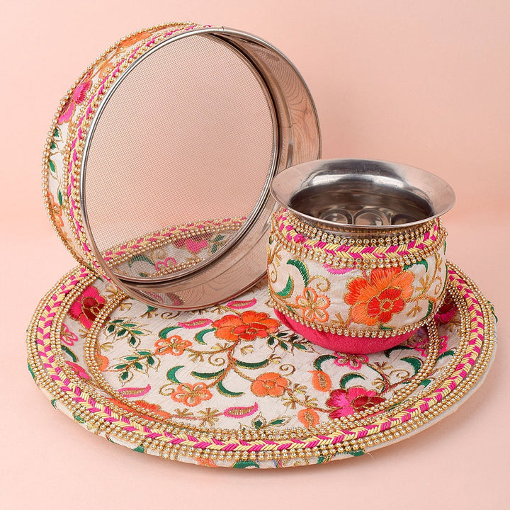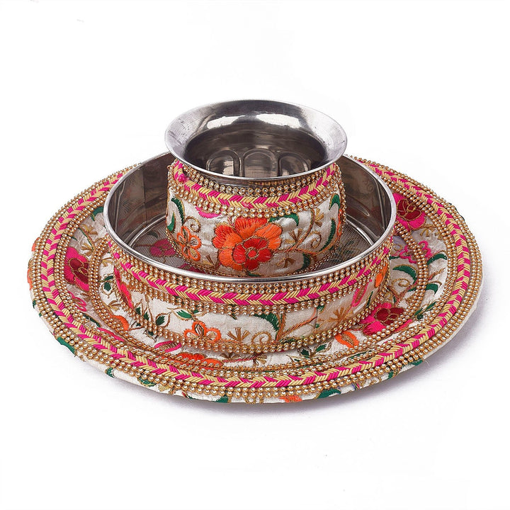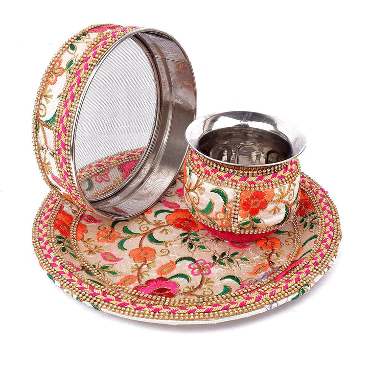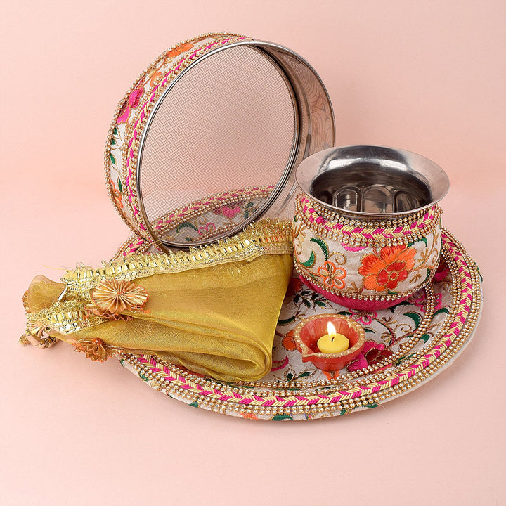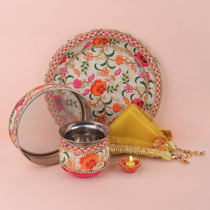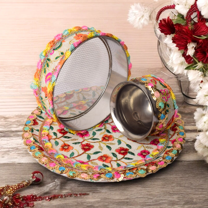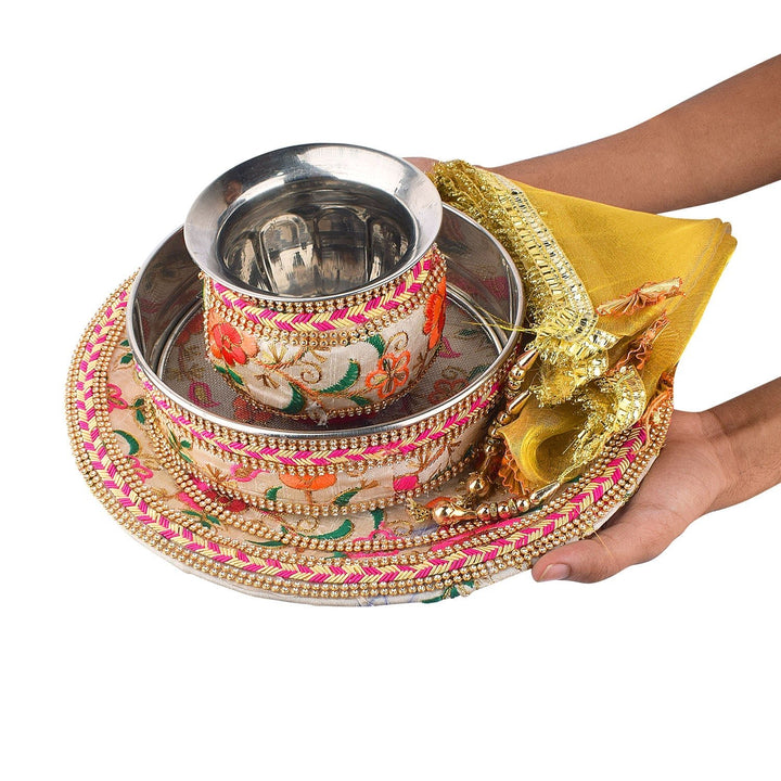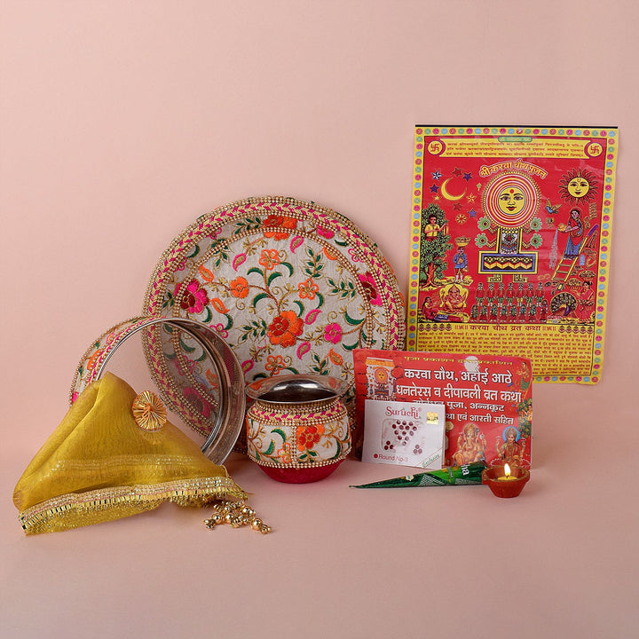 11 Pc Floral Embroidery Karwa Chauth Thali Set with Cover – Satvikworld.com
