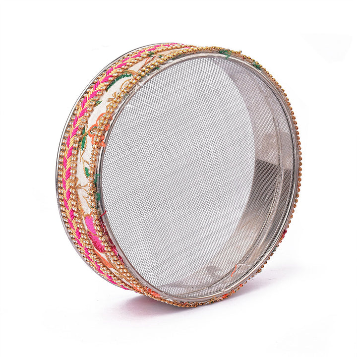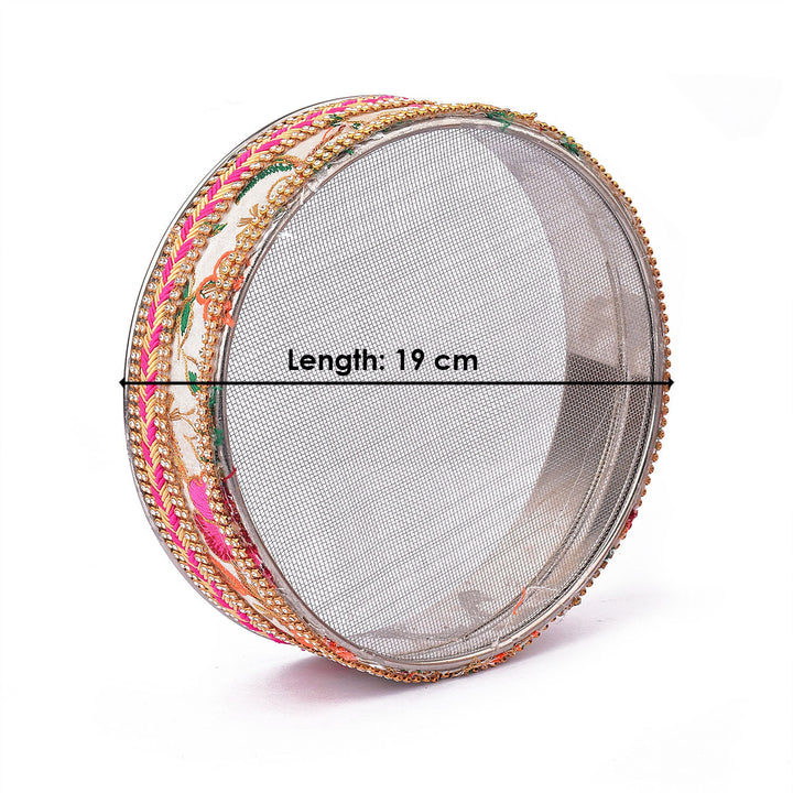 1. Karwa Chauth Thali with Channi and Lota: Our beautifully adorned Karwa Chauth Thali forms the centerpiece of the set. It comes complete with a Channi (sieve) and a Lota (water vessel), essential elements for performing the Karwa Chauth rituals with devotion and reverence.