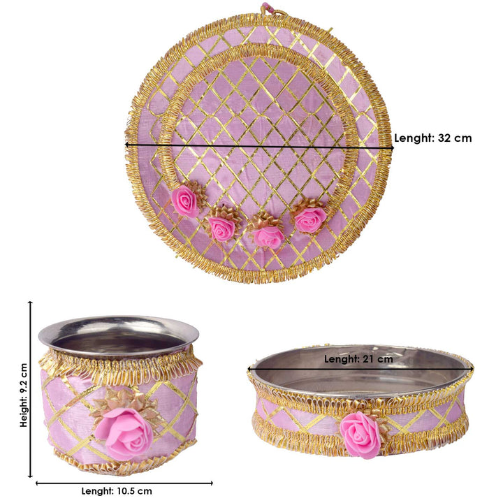 Item Name: 11 Pc Light Pink Embroidery Karwa Chauth Thali Set with Cover – Complete Puja Kit