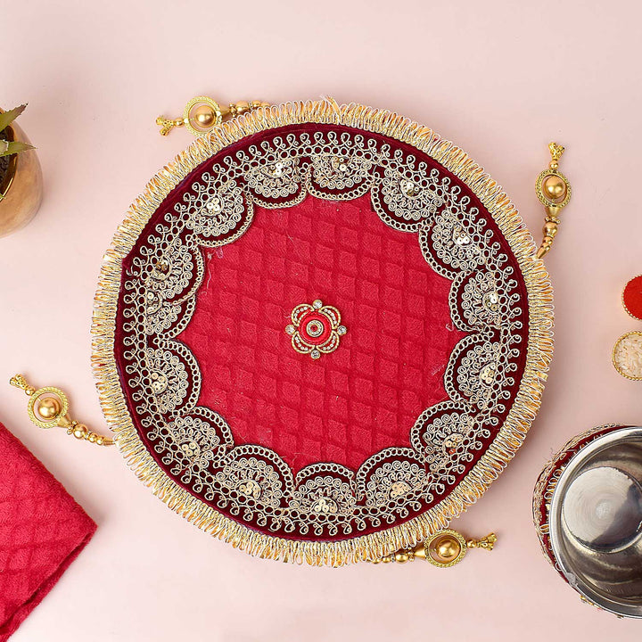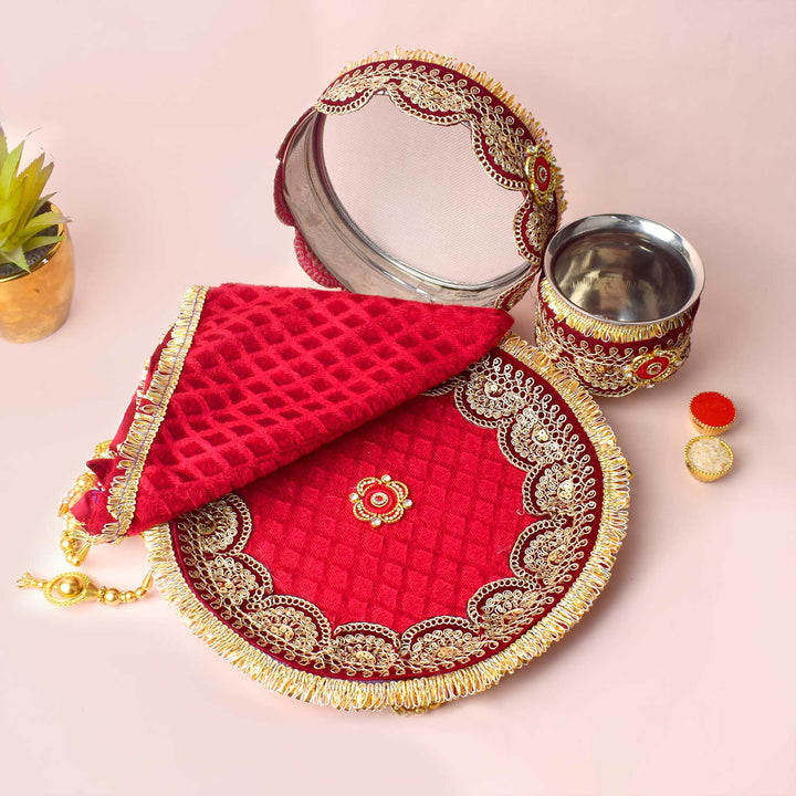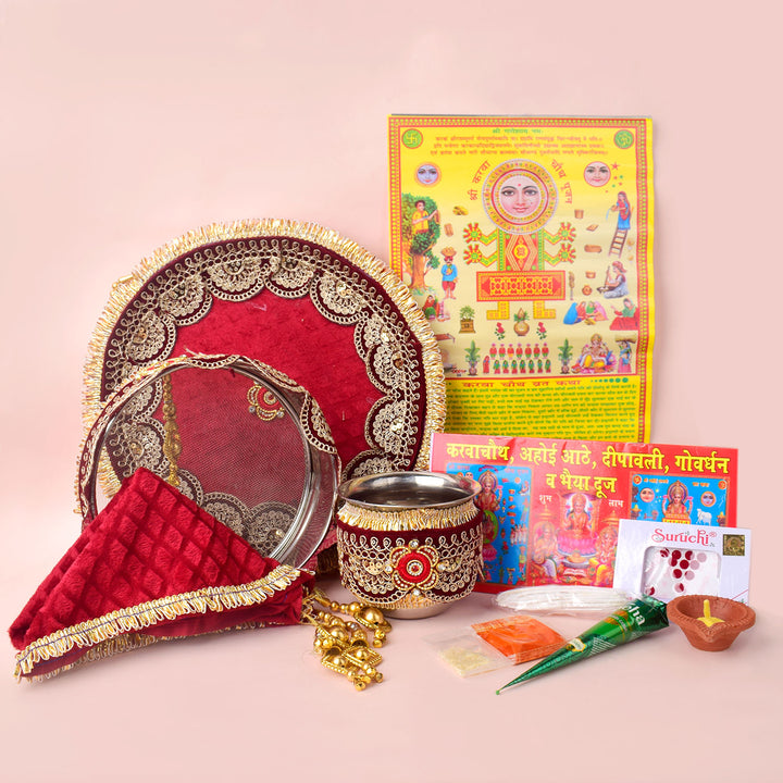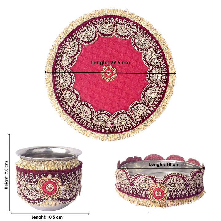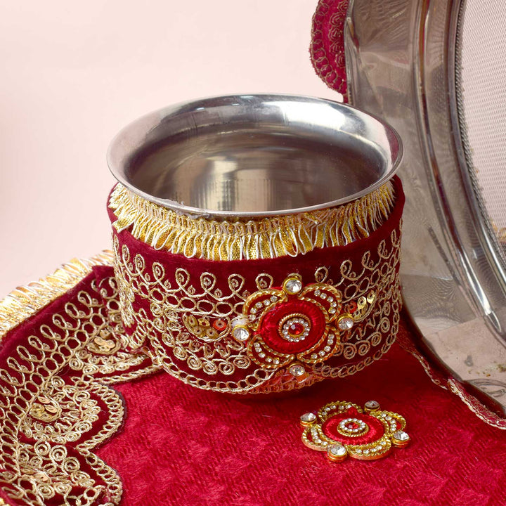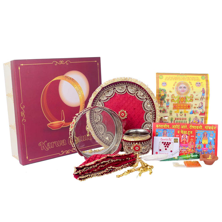 Buy Maroon Embroidery Karwa Chauth Thali Set 11 Pc | Satvikworld.com