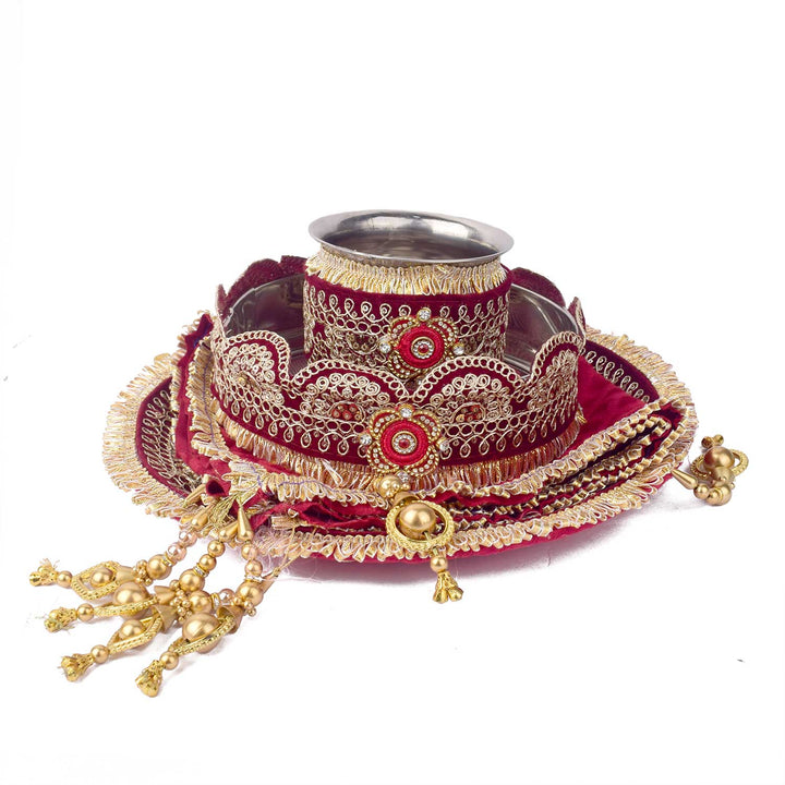 • Designer Maroon Embroidered Thali: Adorned with delicate embroidery, the thali becomes the centerpiece for your rituals, accompanied by a matching channi and kalash.