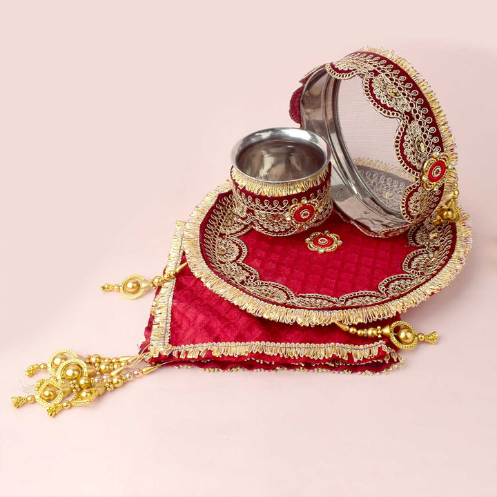 Item Name: 11 Pc Maroon Embroidery Karwa Chauth Thali Set with Cover – Complete Puja Kit