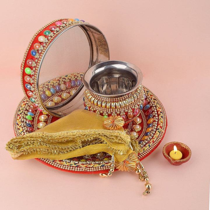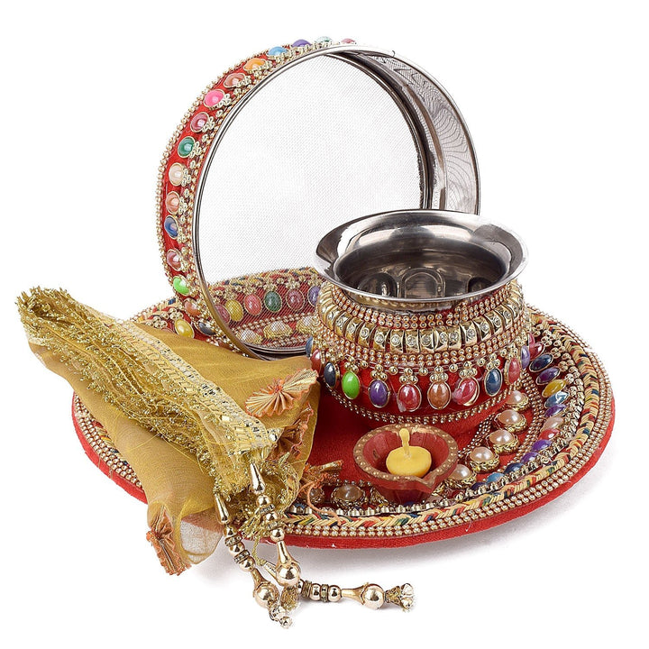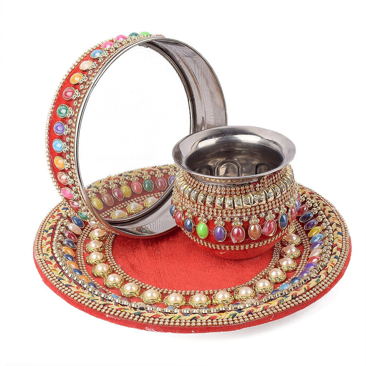 Item Name: 11 Pc Red Beaded Karwa Chauth Thali Set With Cover