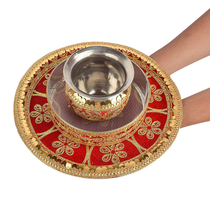 Design: Beautiful Handcrafted Designer Karwa Thali with Fabric all over the Thali and Lace Work all over the Lota and Sieve (Channi), Which makes it more Attractive.