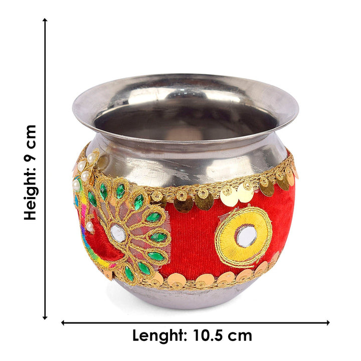 Design: Beautiful Handcrafted Designer Karwa Thali with Fabric all over the Thali and Lace Work all over the Lota and Sieve (Channi), Which makes it more Attractive.
