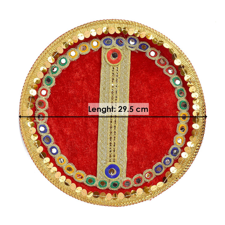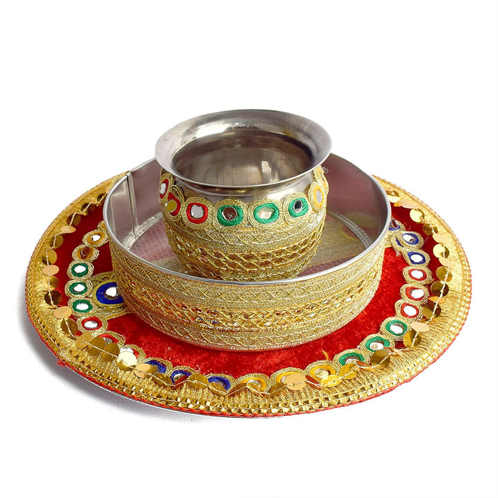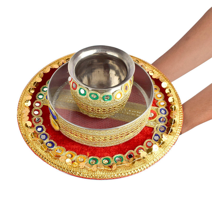 Item Name: Traditional Red Karwa Chauth Thali with Lota and Sieve - 3pc