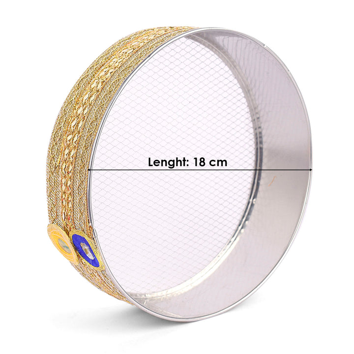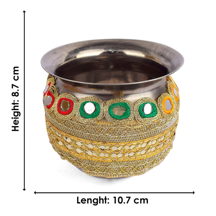 Design: Beautiful Handcrafted Designer Karwa Thali with Fabric all over the Thali and Lace Work all over the Lota and Sieve (Channi), Which makes it more Attractive.