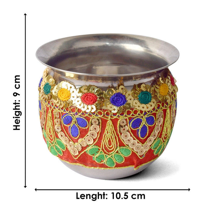 Design: Beautiful Handcrafted Designer Karwa Thali with Fabric all over the Thali and Lace Work all over the Lota and Sieve (Channi), Which makes it more Attractive.