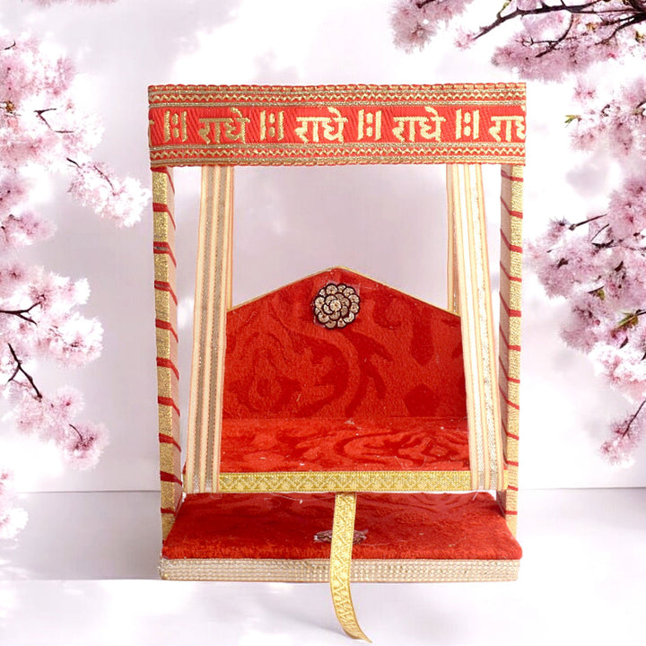 Celebrate the divine love of Radha and Krishna with this Blessed Laddu Gopal Jhula, adorned with beautiful Radhe Radhe print. Made with a sturdy wooden frame and colorful fabric details, this swing brings spiritual charm and vibrant devotion to your pooja space.