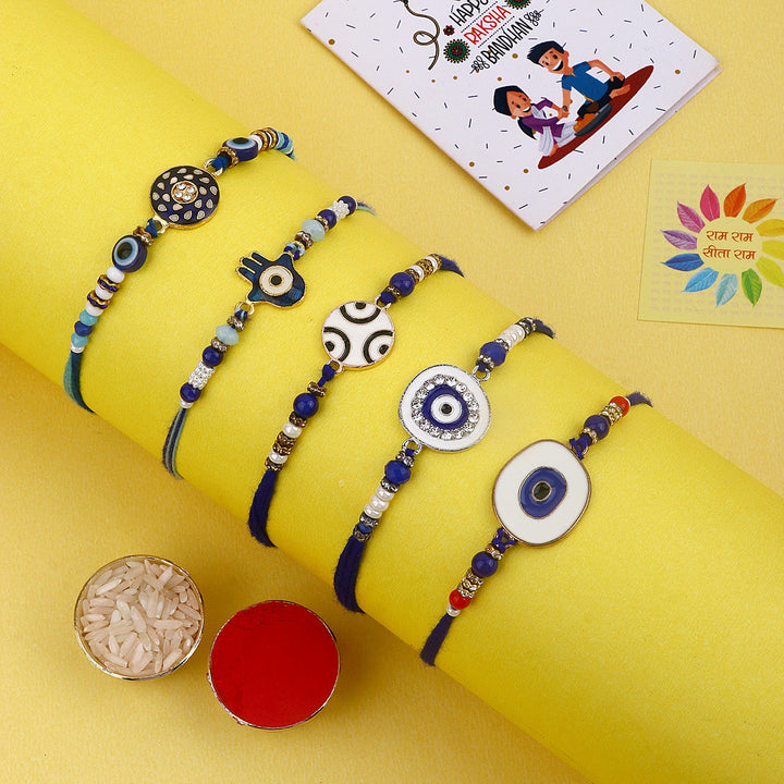 • Item Name: Blessings of Love Evil Eye Rakhi Set of 5