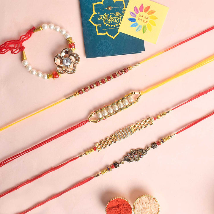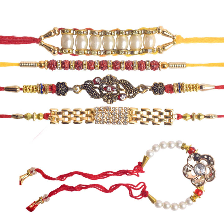 Set of 5 Rakhi | Designer Rakhi Combo | Rakhi Gift Set | Rakhi with Roli Chawal | Buy Rakhi Online | Raksha Bandhan Rakhi Combo | Traditional Rakhi Set | Rakhi for Brother | Rakhi with Blessings Stickers | Family Rakhi Set