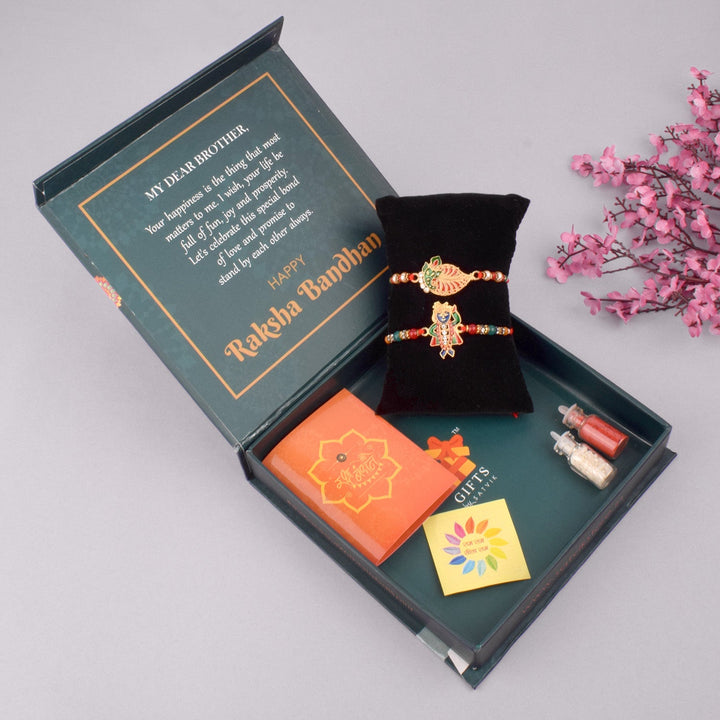 • Package: Set of 2 Bhaiya Rakhi, 1 Greeting card, 1 Roli Chawal Bottle, 1 Designer Gift Box