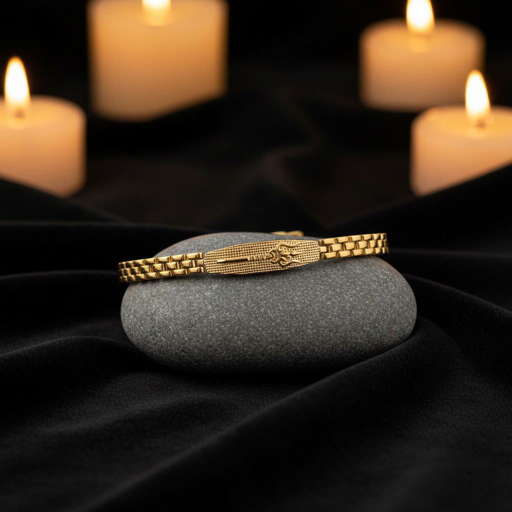 About Product: This Gold Plated Trishul Bracelet is a powerful symbol of strength, protection, and divine energy, crafted with a finely detailed Trishul (Trident) and finished with premium IGP (Ion Gold Plating) coating. The advanced IGP process enhances durability, resists tarnishing, and ensures a long-lasting rich gold shine.