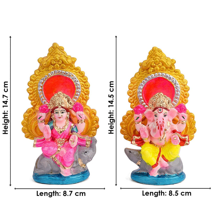 • Product Details: Material: Clay Dimensions: Ganesha: Height: 14.5cm, Length: 8.5cm, Width: 5.6cm, Laxmi: Height: 14.7cm, Length: 8.7cm, Width: 5.6cm, Total weight: 870gram, Finish Type: Glossy.