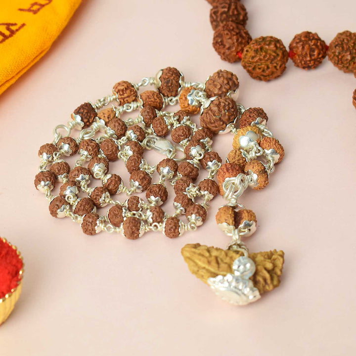 certified rudraksha mala | 1 to 14 mukhi rudraksha mala | indo rudraksha mala | siddh mala silver capping | spiritual rudraksha mala | original rudraksha beads | 14 mukhi mala for men and women | divine protection mala