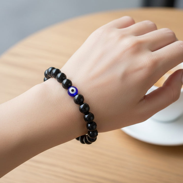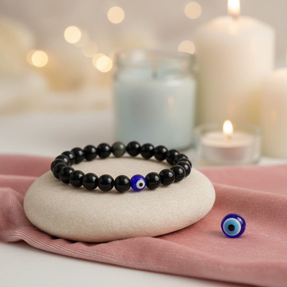 Black Obsidian is known as a powerful protection stone that absorbs negative energy and emotional stress, while the Evil Eye symbol is believed to guard against jealousy and harmful intentions. Together, they create a strong protective energy field that promotes safety, balance, and inner strength.