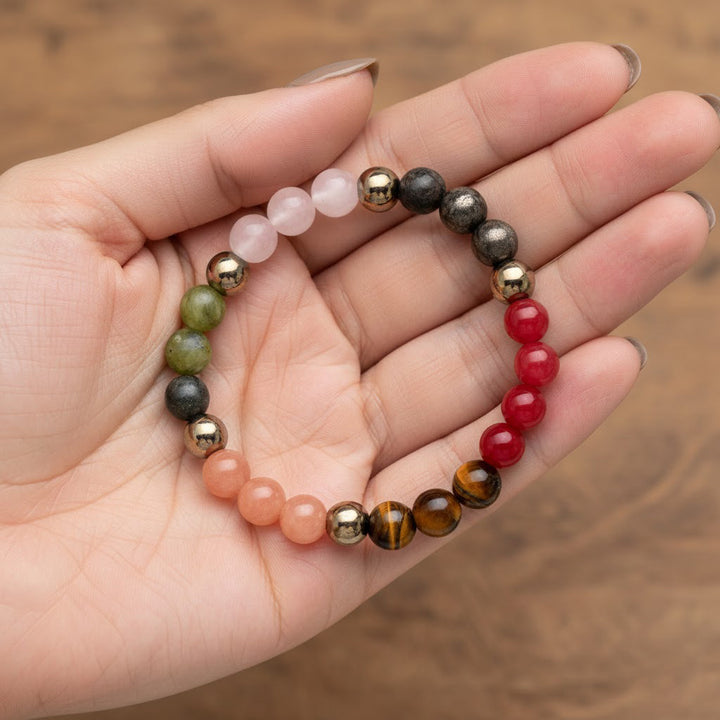 About the Product: The Dhan Vridhi Natural Stone Beaded Bracelet is thoughtfully crafted using a powerful combination of natural healing crystals known for attracting wealth, growth, confidence, and financial stability. This bracelet features Tiger Eye, Quartz, Pyrite, Red Jade, Sunstone, Green Jade, Golden Pyrite. enhanced with elegant gold-tone accents for a premium spiritual look.