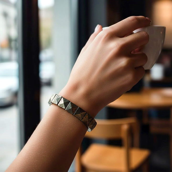 About the Product: The Pyrite Pyramid Square Faced Bracelet is a powerful healing stone accessory crafted from natural pyrite, also known as the Stone of Wealth and Protection. The pyramid square-faced bead design enhances the energy flow of the stone, making it highly effective for attracting abundance, confidence, and positive vibrations.