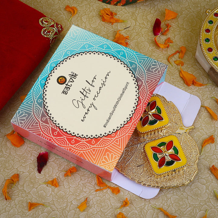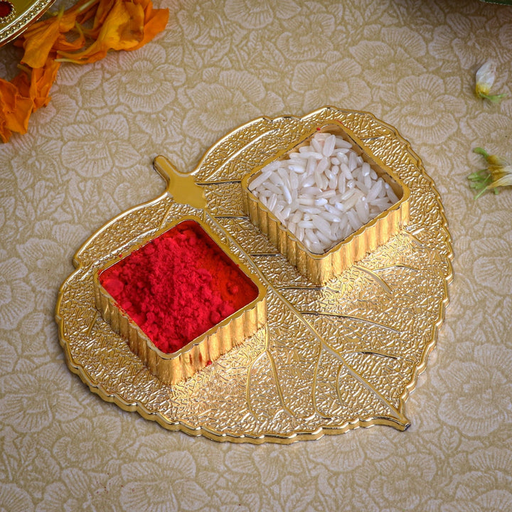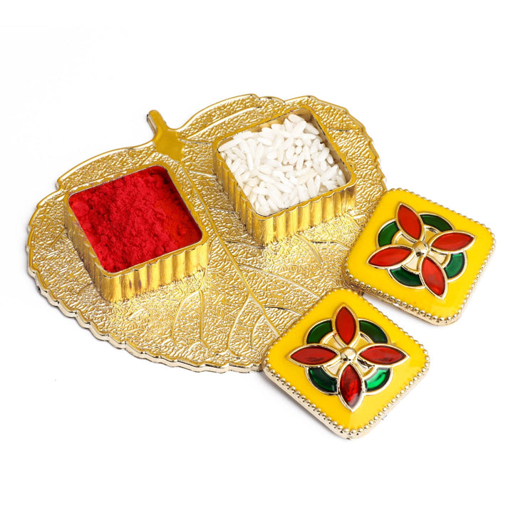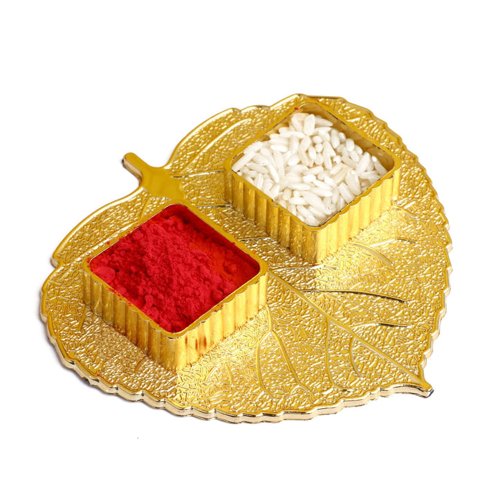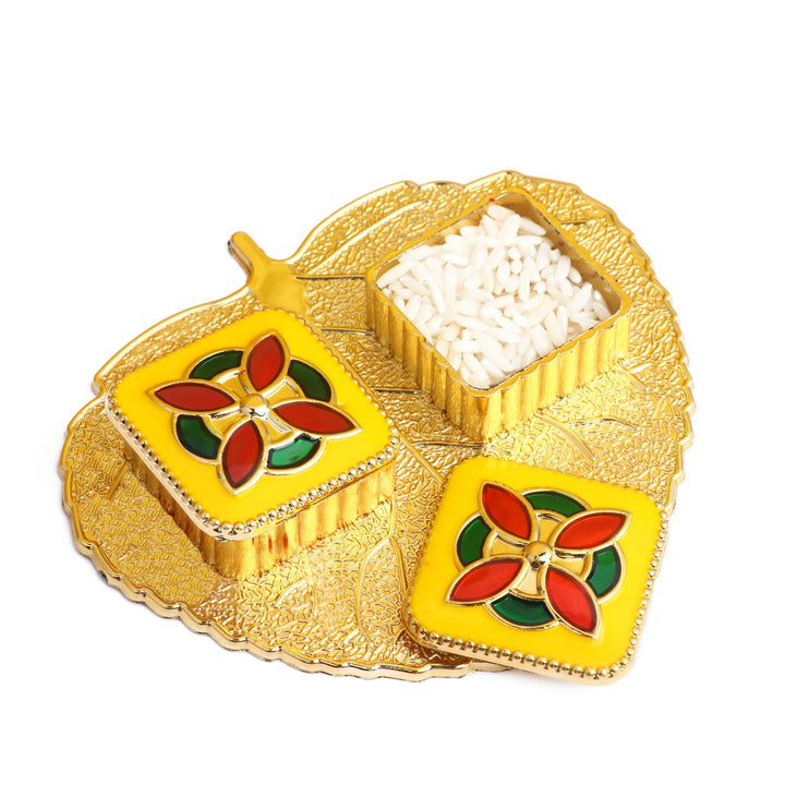 About Product: Satvik Store Presents Adorable Roli Akshat Platter. This small and adorable platter comes adorned with meenakari work and two small bowls attached for roli and akshat on leaf.