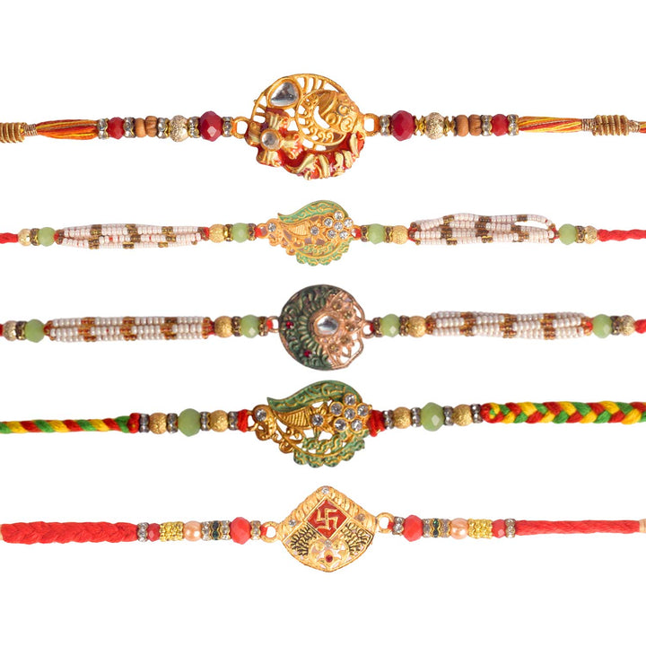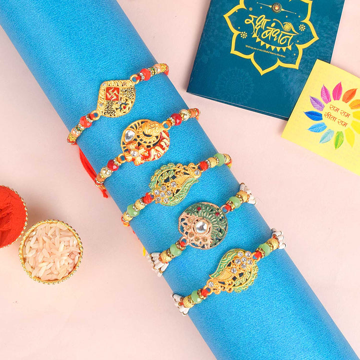 Set of 5 Rakhi | Designer Rakhi Combo | Rakhi Gift Set | Rakhi with Roli Chawal | Buy Rakhi Online | Raksha Bandhan Rakhi Combo | Traditional Rakhi Set | Rakhi for Brother | Rakhi with Blessings Stickers | Family Rakhi Set