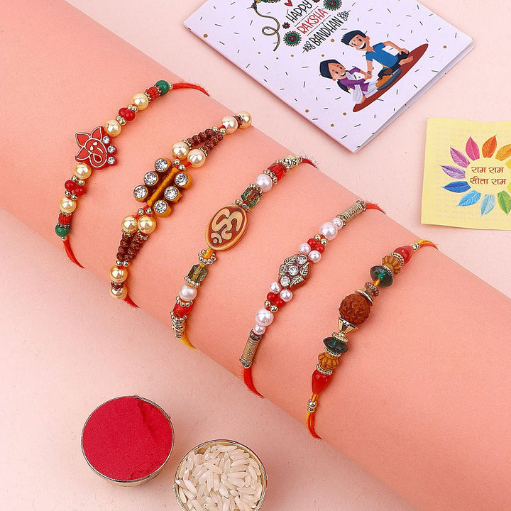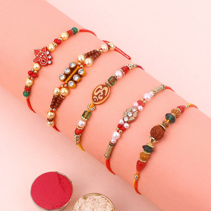 • About Product: Satvik Store Introducing this Assorted Designer Rakhi Set of 5 to make this occasion special. Each rakhi in this collection is a work of art, painstakingly made with elaborate designs and embellished with colorful ornaments. These designer rakhis are a fusion of tradition and modern elegance, with shimmering strands and brilliant stones. Each of the set's rakhis is a special representation of love and protection with a variety of patterns and motifs. Allow your brothers to experience the comfort of their affection by surprising them with this type of lovely collection. Making your celebration of Raksha Bandhan a special occasion by celebrating their bond via our Colourful Designer Rakhi Set of 5.