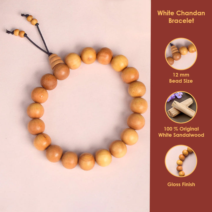 About Product: This Scented White Chandan Bracelet is carefully crafted using  natural 12mm white sandalwood beads, celebrated for their divine aroma and cooling spiritual energy. White Chandan, or Safed Chandan, has been traditionally revered in Vedic rituals for its calming and sacred properties.