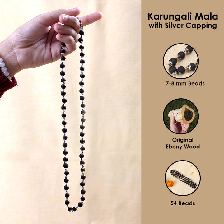 • About Product: The Certified Karungali Mala with elegant silver Plating capping is a sacred spiritual tool known for its powerful protective and healing energy. Revered in South Indian traditions, especially in Tamil Nadu, this mala is ideal for those seeking spiritual protection, focus in meditation, and alignment with divine energy.