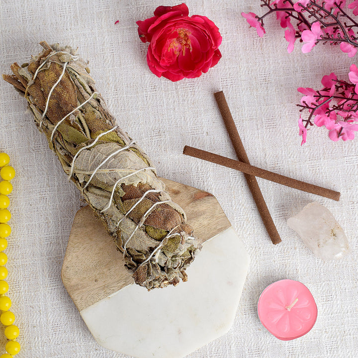 • About Product: We at Satvikstore.in Experience the captivating aroma and healing energy of our Mexican Incense Sage with Clear Quartz Crystal Healing Smudge. Immerse yourself in the ancient traditions of Mexican incense sage while harnessing the amplifying and purifying power of clear quartz crystal. This powerful combination purifies your space, enhances spiritual clarity, and promotes positive energy flow. Elevate your rituals with our handcrafted smudge, carefully created for superior quality. Discover the transformative benefits of Mexican Incense Sage with Clear Quartz Crystal Healing Smudge and invite purification, clarity, and harmonious vibrations into your life. Create a sacred space that uplifts and revitalizes your spirit.